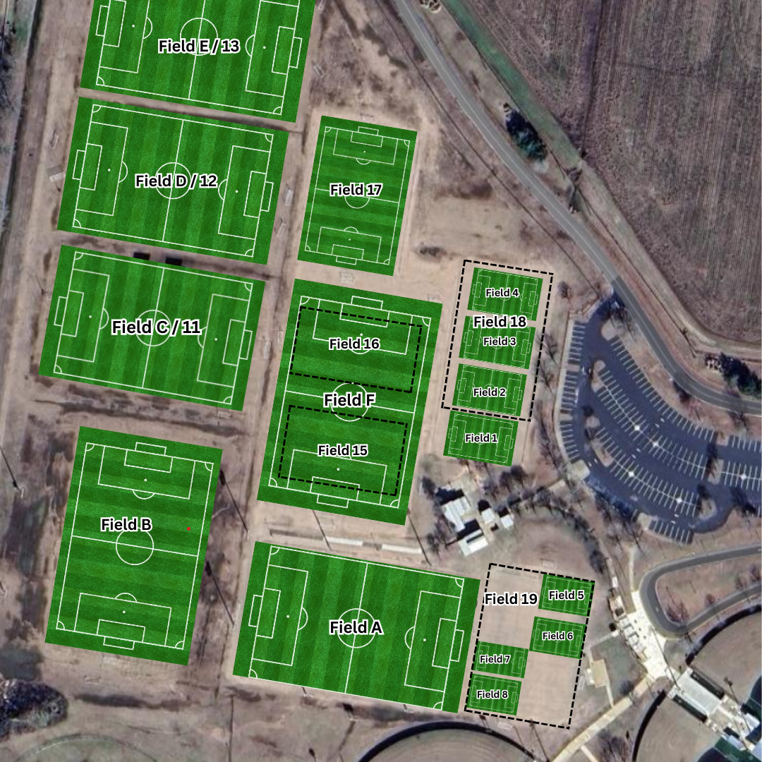Our practice facility featuring multiple soccer fields and greenspace. Restrooms available.